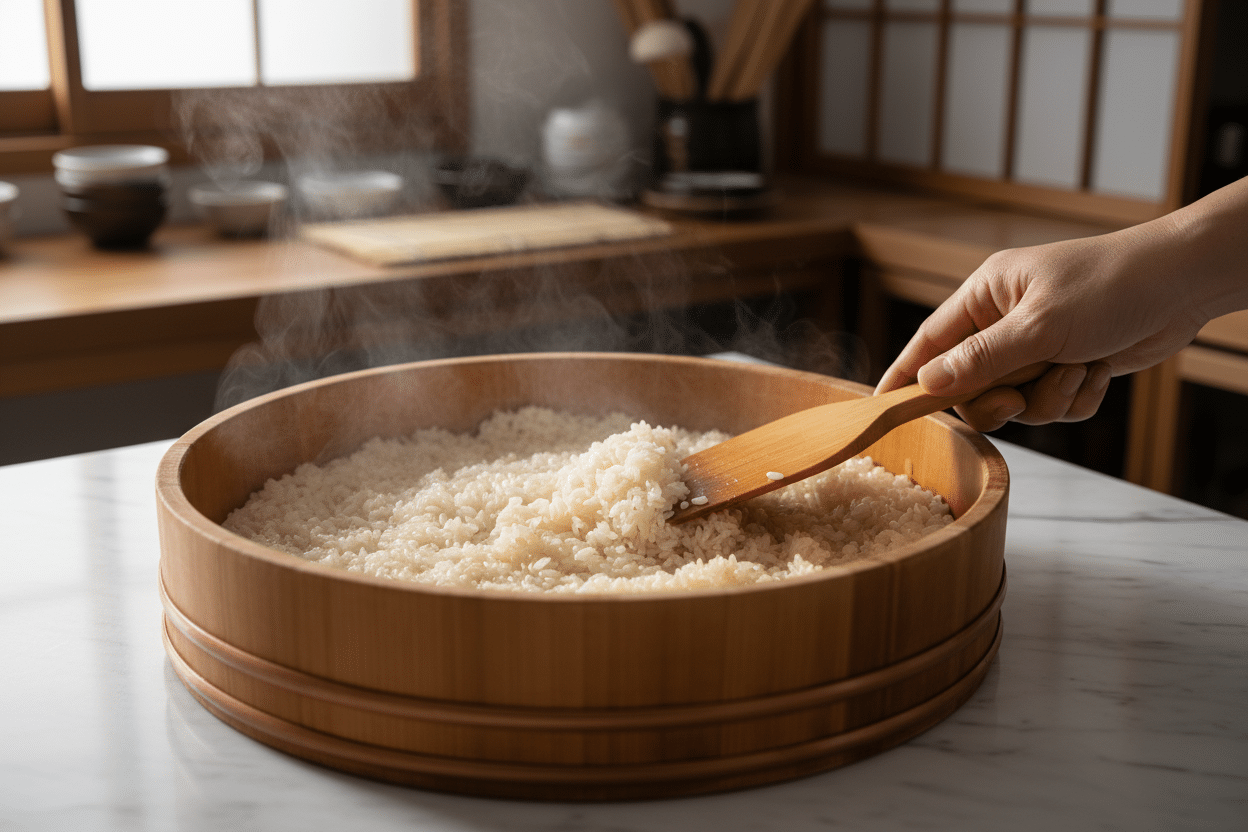 Das Dressing gleichmäßig über den Reis träufeln und mit einem Holzspatel oder Shamoji (dem japanischen Reisschaber) in schneidenden, horizontalen Bewegungen einarbeiten. Nie rühren, nie drücken. Die Körner sollen einzeln bleiben, nicht zerquetscht werden. Gleichzeitig den Reis mit einem Fächer oder Fächerbewegungen abkühlen, um überschüssige Feuchtigkeit zu entfernen und dem Reis seinen charakteristischen Glanz zu geben.